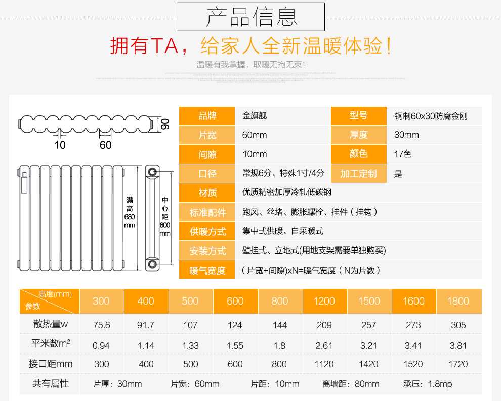 金旗舰钢制暖气片,一体成形,无焊点,水流量大,寿命长,造型美观;具有热稳定性好,附着力强,耐腐蚀强,耐久性高、光泽度强,钢制暖气片5年质保,只换不修。